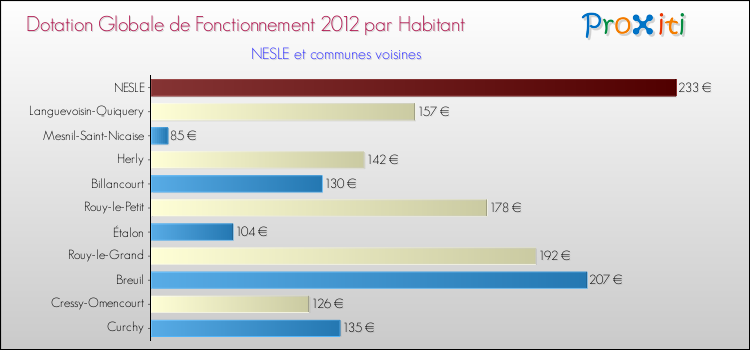 Le graphique ci dessous indique la Dotation Globale de Fonctionnement accordée par habitant à Nesle en 2012 par rapport aux communes voisines.
