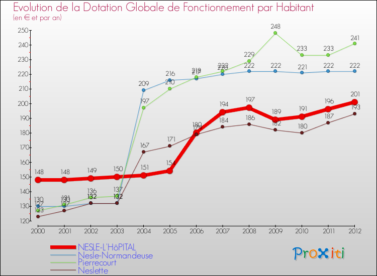 Le graphique ci dessous indique la Dotation Globale de Fonctionnement accordée par habitant à Nesle-l'Hôpital en 2012 par rapport aux communes voisines.