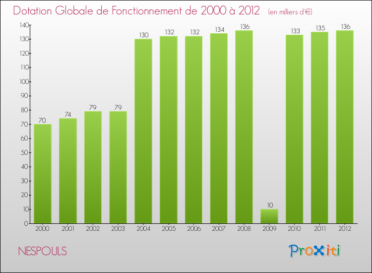Dans le même temps, la Dotation Globale de Fonctionnement accordée aux communes françaises similaires à Nespouls était de 214 € par habitant, en 2012.