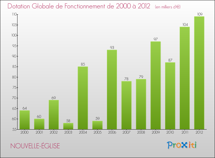 En effet, la dotation globale de fonctionnement versée par l'état en 2012 à la seule commune de Nouvelle-Église était de : 109 000 € au total.