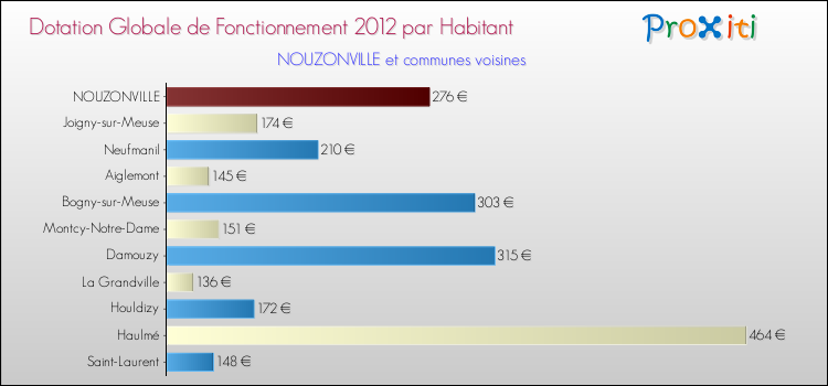 Le graphique ci dessous indique la Dotation Globale de Fonctionnement accordée par habitant à Nouzonville en 2012 par rapport aux communes voisines.