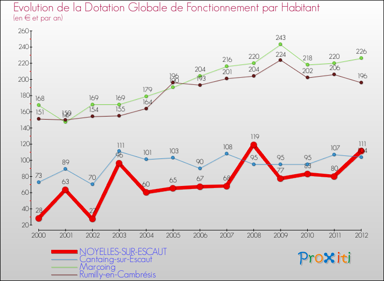 Dans le même temps, la Dotation Globale de Fonctionnement accordée aux communes françaises similaires à Noyelles-sur-Escaut était de 173 € par habitant, en 2012.
