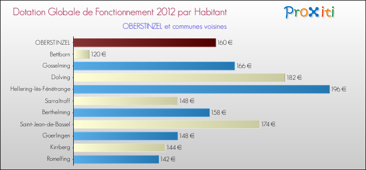 Le graphique ci dessous indique la Dotation Globale de Fonctionnement accordée par habitant à Oberstinzel en 2012 par rapport aux communes voisines.