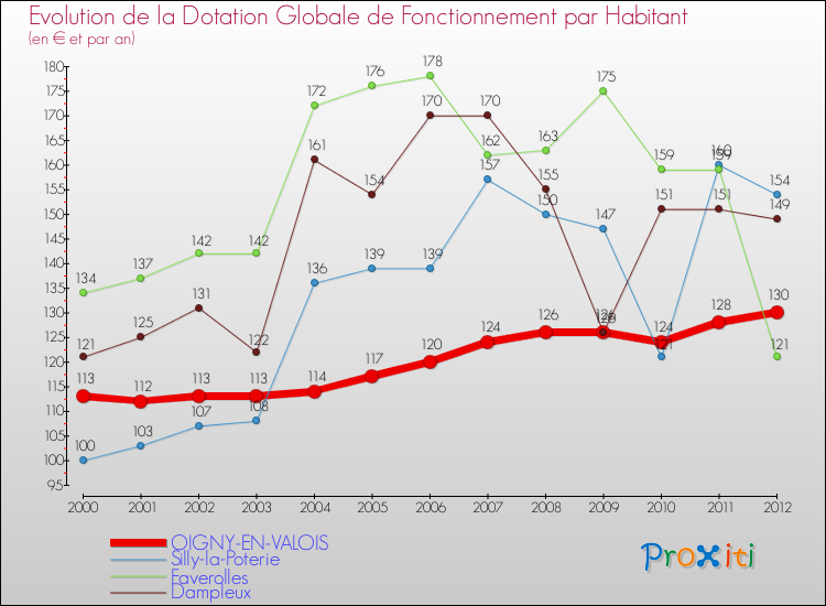 Dans le même temps, la Dotation Globale de Fonctionnement accordée aux communes françaises similaires à Oigny-en-Valois était de 228 € par habitant, en 2012.