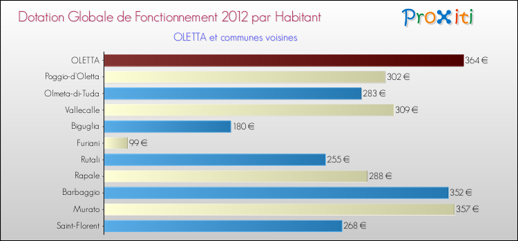 Le graphique ci dessous indique la Dotation Globale de Fonctionnement accordée par habitant à Oletta en 2012 par rapport aux communes voisines.