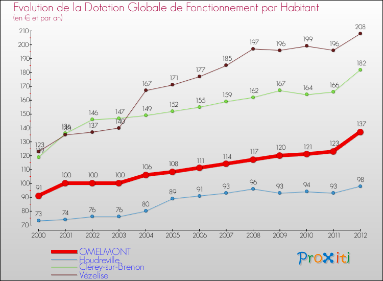 Dans le même temps, la Dotation Globale de Fonctionnement accordée aux communes françaises similaires à Omelmont était de 232 € par habitant, en 2012.