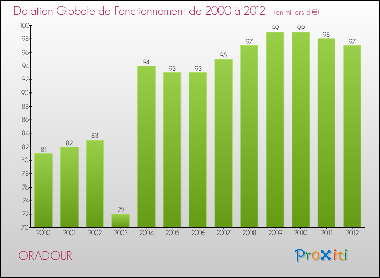 Dans le même temps, la Dotation Globale de Fonctionnement accordée aux communes françaises similaires à Oradour était de 181 € par habitant, en 2012.