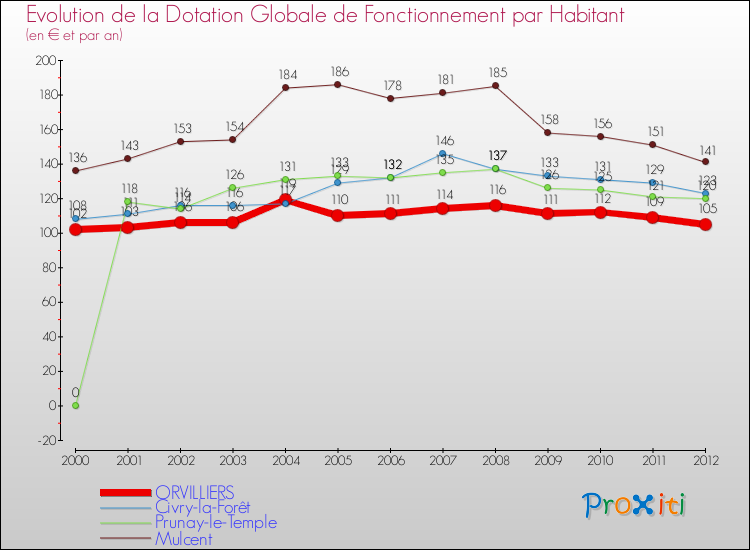 Dans le même temps, la Dotation Globale de Fonctionnement accordée aux communes françaises similaires à Orvilliers était de 173 € par habitant, en 2012.