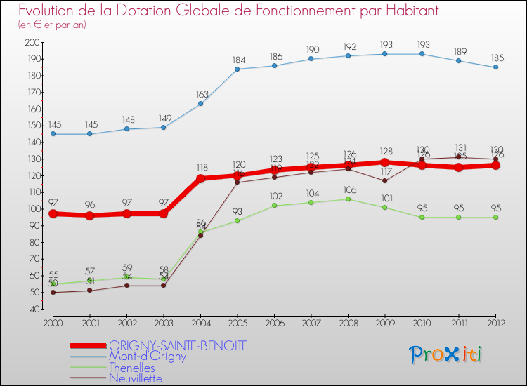 Dans le même temps, la Dotation Globale de Fonctionnement accordée aux communes françaises similaires à Origny-Sainte-Benoite était de 214 € par habitant, en 2012.