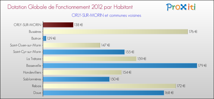 Le graphique ci dessous indique la Dotation Globale de Fonctionnement accordée par habitant à Orly-sur-Morin en 2012 par rapport aux communes voisines.