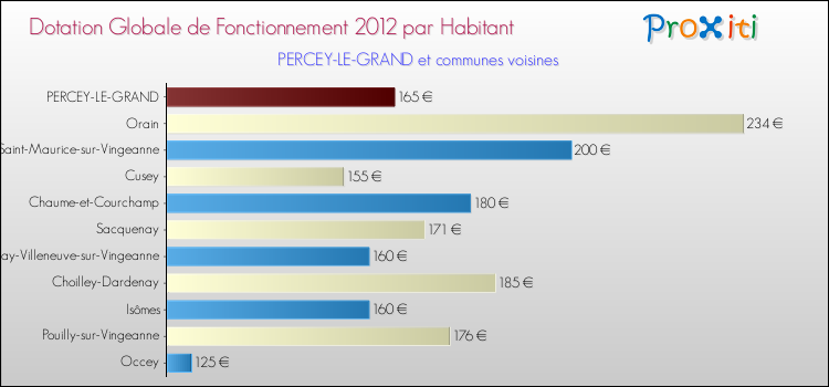 Le graphique ci dessous indique la Dotation Globale de Fonctionnement accordée par habitant à Percey-le-Grand en 2012 par rapport aux communes voisines.