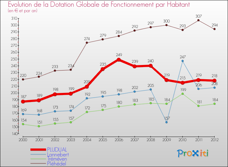 Dans le même temps, la Dotation Globale de Fonctionnement accordée aux communes françaises similaires à Pludual était de 173 € par habitant, en 2012.