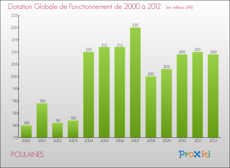 Dans le même temps, la Dotation Globale de Fonctionnement accordée aux communes françaises similaires à Poulaines était de 173 € par habitant, en 2012.