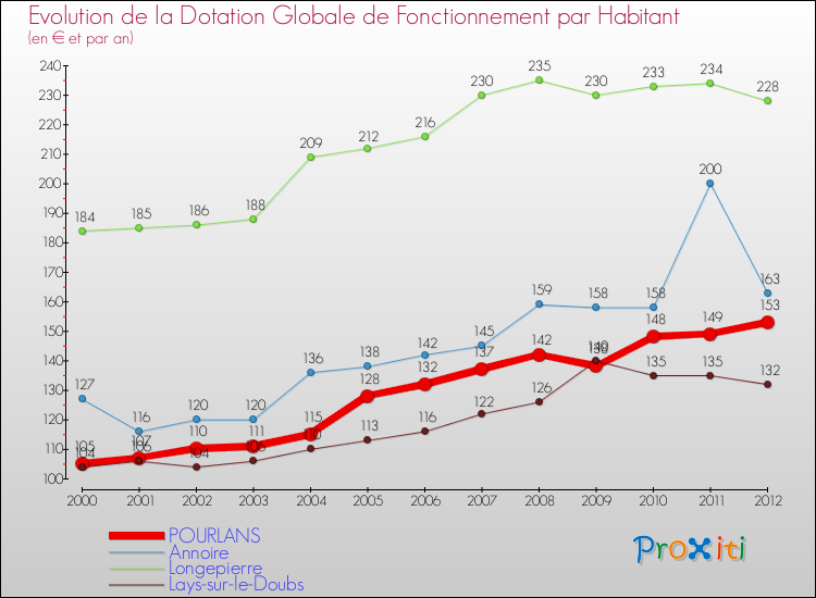 Dans le même temps, la Dotation Globale de Fonctionnement accordée aux communes françaises similaires à Pourlans était de 232 € par habitant, en 2012.