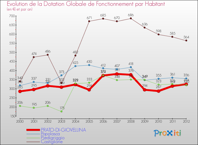 Le graphique ci dessous indique la Dotation Globale de Fonctionnement accordée par habitant à Prato-di-Giovellina en 2012 par rapport aux communes voisines.