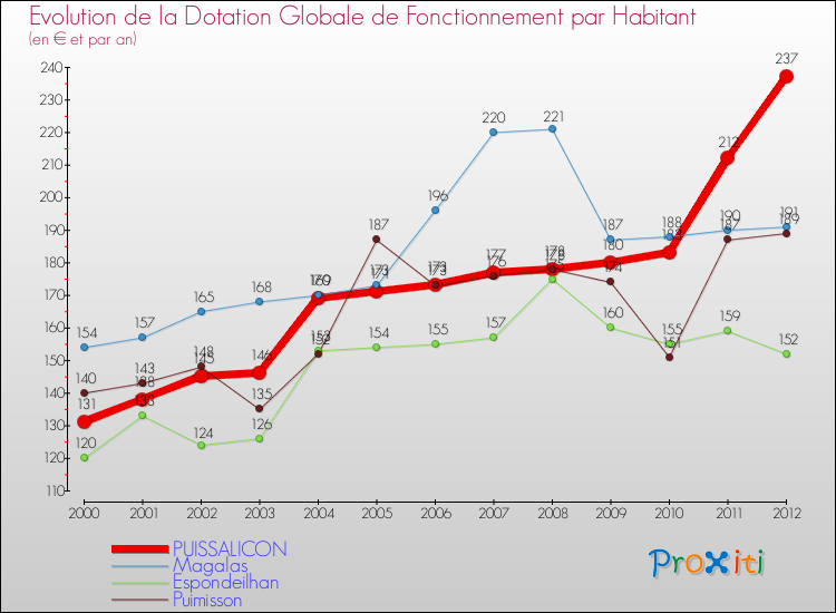 Dans le même temps, la Dotation Globale de Fonctionnement accordée aux communes françaises similaires à Puissalicon était de 173 € par habitant, en 2012.