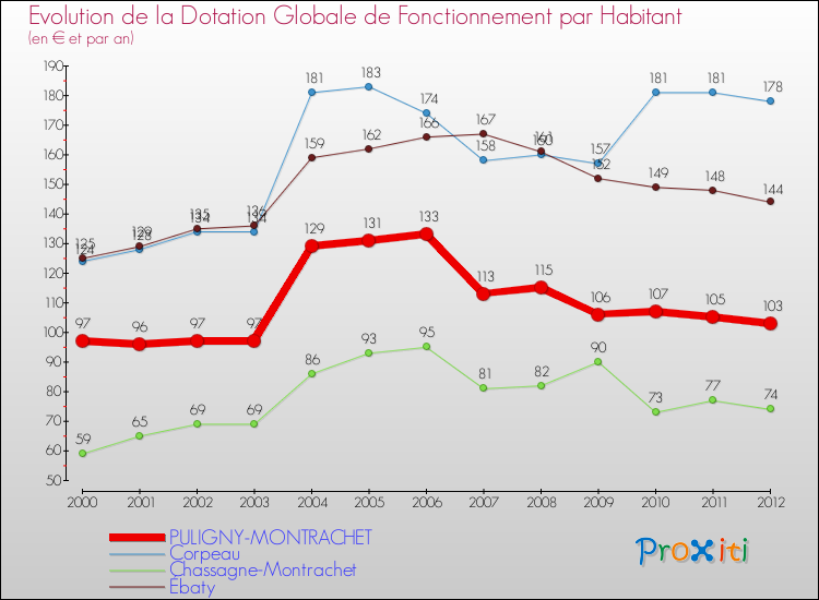 Dans le même temps, la Dotation Globale de Fonctionnement accordée aux communes françaises similaires à Puligny-Montrachet était de 181 € par habitant, en 2012.