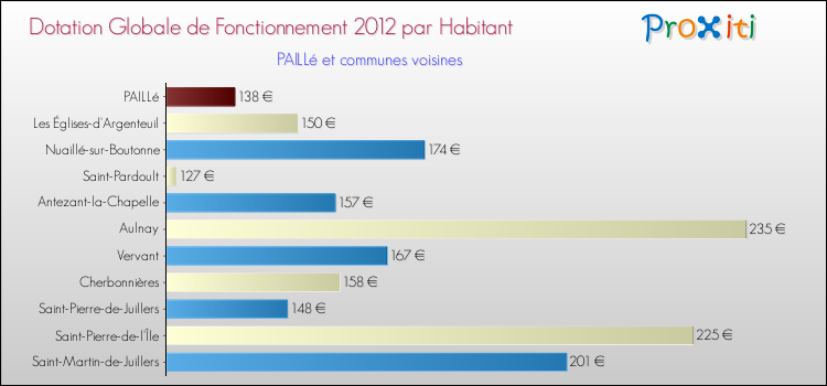 Le graphique ci dessous indique la Dotation Globale de Fonctionnement accordée par habitant à Paillé en 2012 par rapport aux communes voisines.