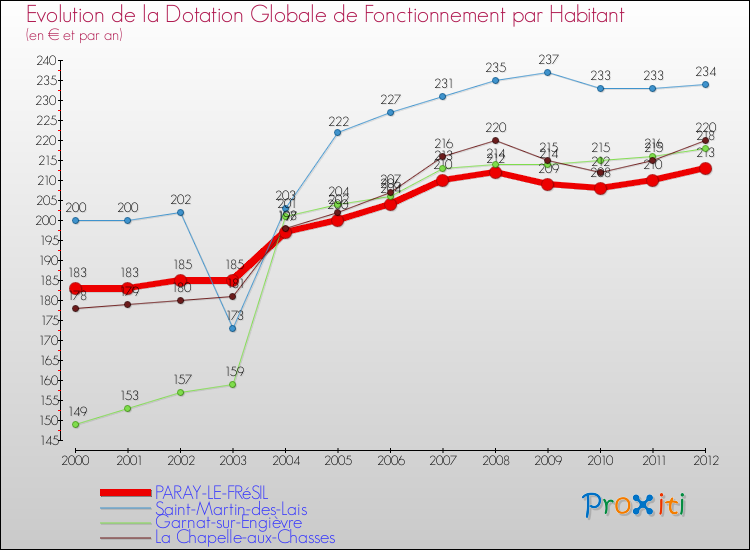 Dans le même temps, la Dotation Globale de Fonctionnement accordée aux communes françaises similaires à Paray-le-Frésil était de 200 € par habitant, en 2012.