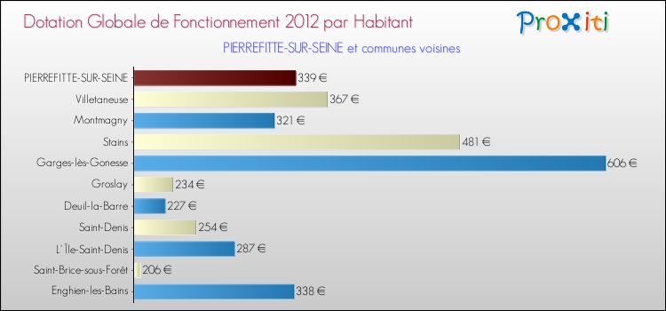 Le graphique ci dessous indique la Dotation Globale de Fonctionnement accordée par habitant à Pierrefitte-sur-Seine en 2012 par rapport aux communes voisines.