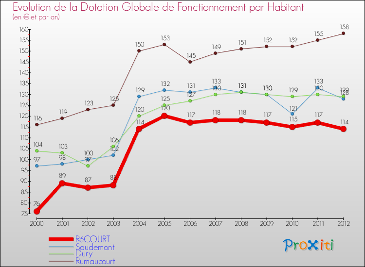 Dans le même temps, la Dotation Globale de Fonctionnement accordée aux communes françaises similaires à Récourt était de 228 € par habitant, en 2012.