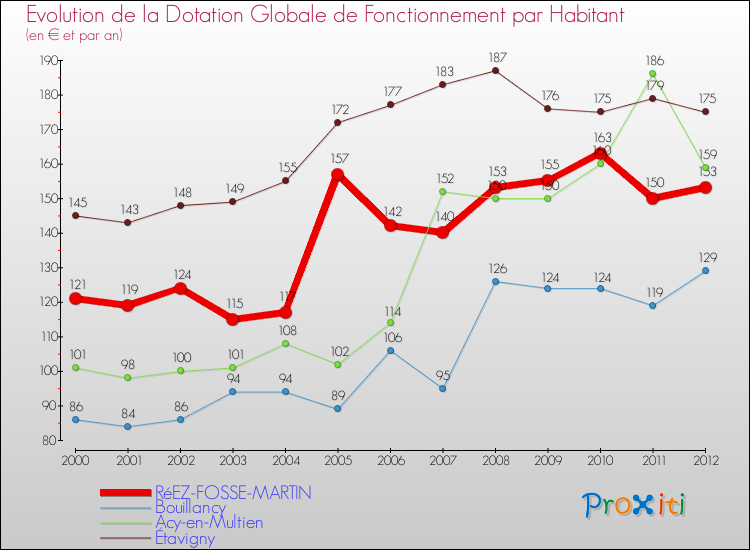 Le graphique ci dessous indique la Dotation Globale de Fonctionnement accordée par habitant à Réez-Fosse-Martin en 2012 par rapport aux communes voisines.