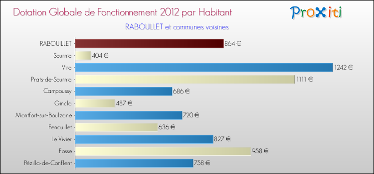 Le graphique ci dessous indique la Dotation Globale de Fonctionnement accordée par habitant à Rabouillet en 2012 par rapport aux communes voisines.