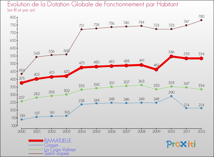 Dans le même temps, la Dotation Globale de Fonctionnement accordée aux communes françaises similaires à Ramatuelle était de 304 € par habitant, en 2012.