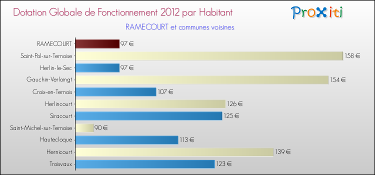 Le graphique ci dessous indique la Dotation Globale de Fonctionnement accordée par habitant à Ramecourt en 2012 par rapport aux communes voisines.