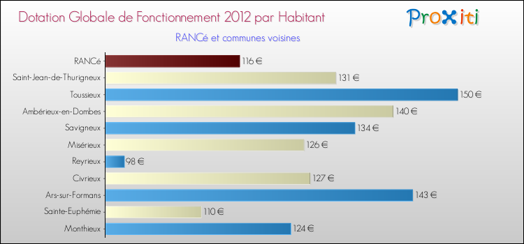 Le graphique ci dessous indique la Dotation Globale de Fonctionnement accordée par habitant à Rancé en 2012 par rapport aux communes voisines.