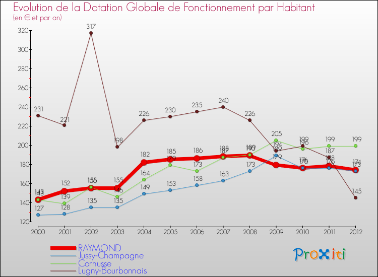 Dans le même temps, la Dotation Globale de Fonctionnement accordée aux communes françaises similaires à Raymond était de 232 € par habitant, en 2012.