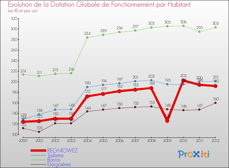 Evolution du montant de la Dotation Globale de Fonctionnement pour REGNIOWEZ de 2000 à 2012