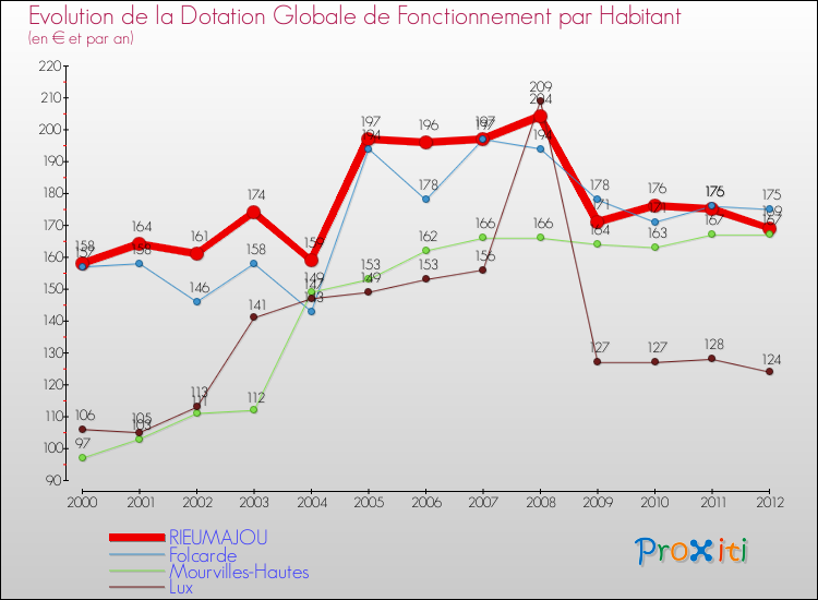 Dans le même temps, la Dotation Globale de Fonctionnement accordée aux communes françaises similaires à Rieumajou était de 232 € par habitant, en 2012.