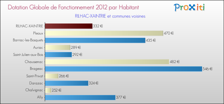 Le graphique ci dessous indique la Dotation Globale de Fonctionnement accordée par habitant à Rilhac-Xaintrie en 2012 par rapport aux communes voisines.