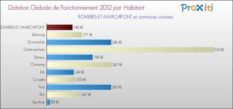 Le graphique ci dessous indique la Dotation Globale de Fonctionnement accordée par habitant à Rombies-et-Marchipont en 2012 par rapport aux communes voisines.