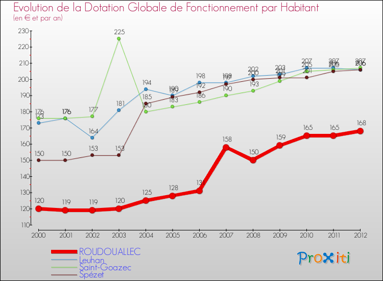 Dans le même temps, la Dotation Globale de Fonctionnement accordée aux communes françaises similaires à Roudouallec était de 173 € par habitant, en 2012.