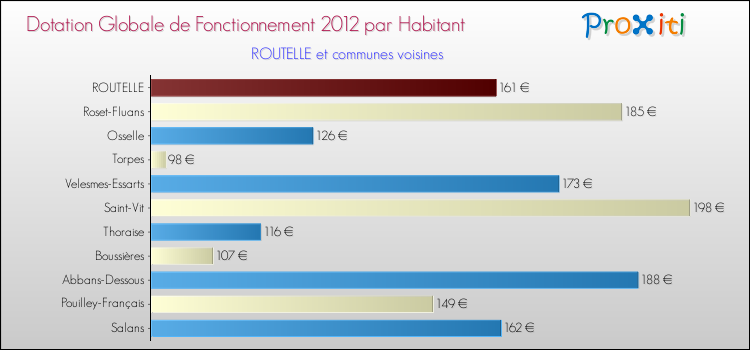 Le graphique ci dessous indique la Dotation Globale de Fonctionnement accordée par habitant à Routelle en 2012 par rapport aux communes voisines.