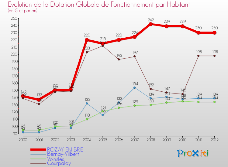 Dans le même temps, la Dotation Globale de Fonctionnement accordée aux communes françaises similaires à Rozay-en-Brie était de 236 € par habitant, en 2012.