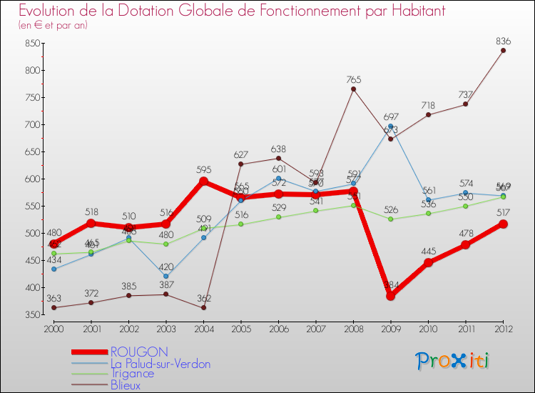 Dans le même temps, la Dotation Globale de Fonctionnement accordée aux communes françaises similaires à Rougon était de 232 € par habitant, en 2012.