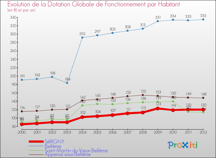 Dans le même temps, la Dotation Globale de Fonctionnement accordée aux communes françaises similaires à Sérigny était de 200 € par habitant, en 2012.
