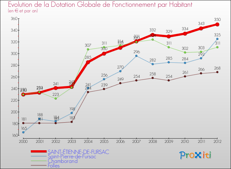 Le graphique ci dessous indique la Dotation Globale de Fonctionnement accordée par habitant à Saint-Étienne-de-Fursac en 2012 par rapport aux communes voisines.