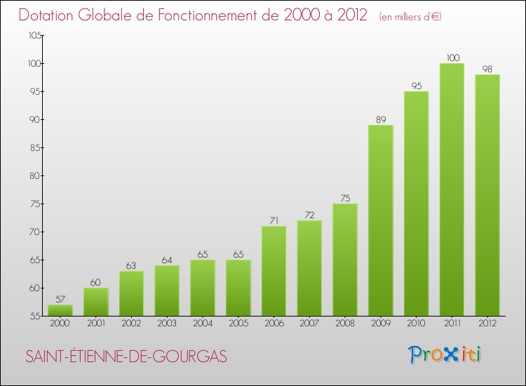 Dans le même temps, la Dotation Globale de Fonctionnement accordée aux communes françaises similaires à Saint-Étienne-de-Gourgas était de 181 € par habitant, en 2012.
