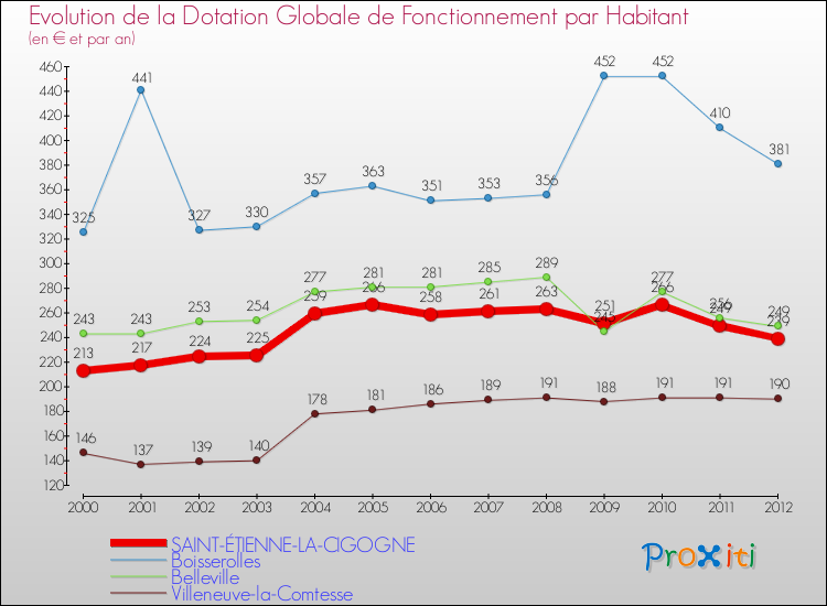 Dans le même temps, la Dotation Globale de Fonctionnement accordée aux communes françaises similaires à Saint-Étienne-la-Cigogne était de 228 € par habitant, en 2012.