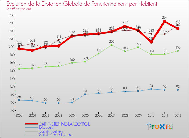 Le graphique ci dessous indique la Dotation Globale de Fonctionnement accordée par habitant à Saint-Étienne-Lardeyrol en 2012 par rapport aux communes voisines.