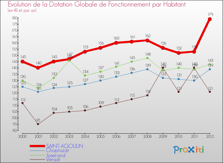 Dans le même temps, la Dotation Globale de Fonctionnement accordée aux communes françaises similaires à Saint-Agoulin était de 181 € par habitant, en 2012.