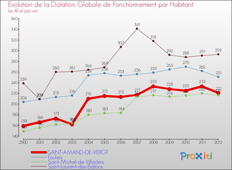 Dans le même temps, la Dotation Globale de Fonctionnement accordée aux communes françaises similaires à Saint-Amand-de-Vergt était de 232 € par habitant, en 2012.
