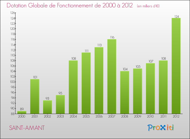 Dans le même temps, la Dotation Globale de Fonctionnement accordée aux communes françaises similaires à Saint-Amant était de 173 € par habitant, en 2012.