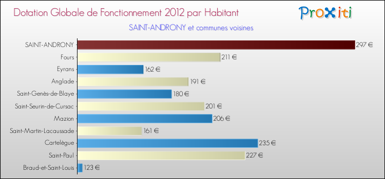 Le graphique ci dessous indique la Dotation Globale de Fonctionnement accordée par habitant à Saint-Androny en 2012 par rapport aux communes voisines.