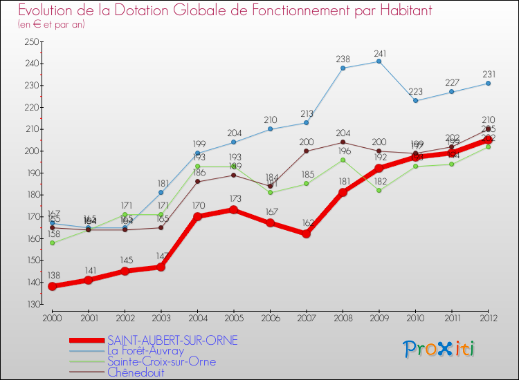 Le graphique ci dessous indique la Dotation Globale de Fonctionnement accordée par habitant à Saint-Aubert-sur-Orne en 2012 par rapport aux communes voisines.