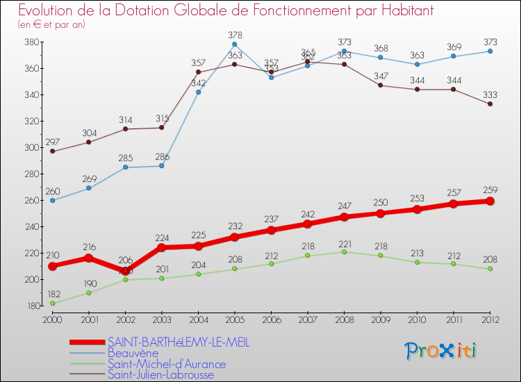 Le graphique ci dessous indique la Dotation Globale de Fonctionnement accordée par habitant à Saint-Barthélemy-le-Meil en 2012 par rapport aux communes voisines.